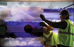 She then showed a photo of a border crossing between the state of New York and the Mohawk nation. A the juncture of the two nations, artist Alan Michelson (Mohawk) has installed Third Bank of the River, a 40-foot-long glass rendering of the St. Lawrence River—a river that divides Canada and the US.