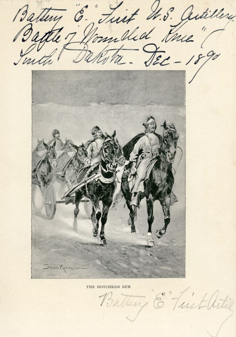 American gunmaker Benjamin Berkeley Hotchkiss (1826-1885) built a factory in France in the mid-1800s, where he would create a “revolving barrel gun”—the precursor to the machine gun—known as the “Hotchkiss.” Artist Frederic Remington drew an image of the military leaving the dead behind at the Wounded Knee battleground with the Hotchkiss in tow. Image is in the public domain and available at the National Archives.